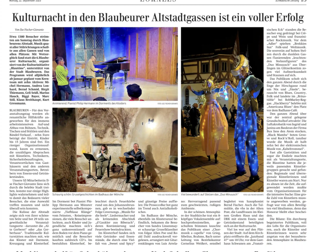 SWP vom 14.9.2025: https://www.swp.de/lokales/ulm/kulturnacht-in-blaubeuren-in-der-idyllischen-altstadt-singt-und-klingt-es-aus-allen-ecken-78311172.html