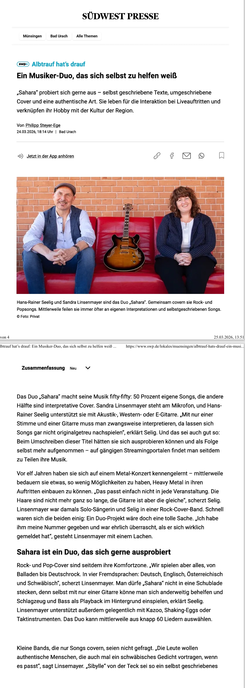 SaHaRa: Herzlichen Dank an Frau Weiß und die Südwestpresse: Ganz aufgeregt arbeiten wir gerade an einem Demo-Video sowie an einem eigenen schwäbischen Song von Hans und einer neuen CD. Mehr gibt es demächst, lassen Sie sich überraschen!